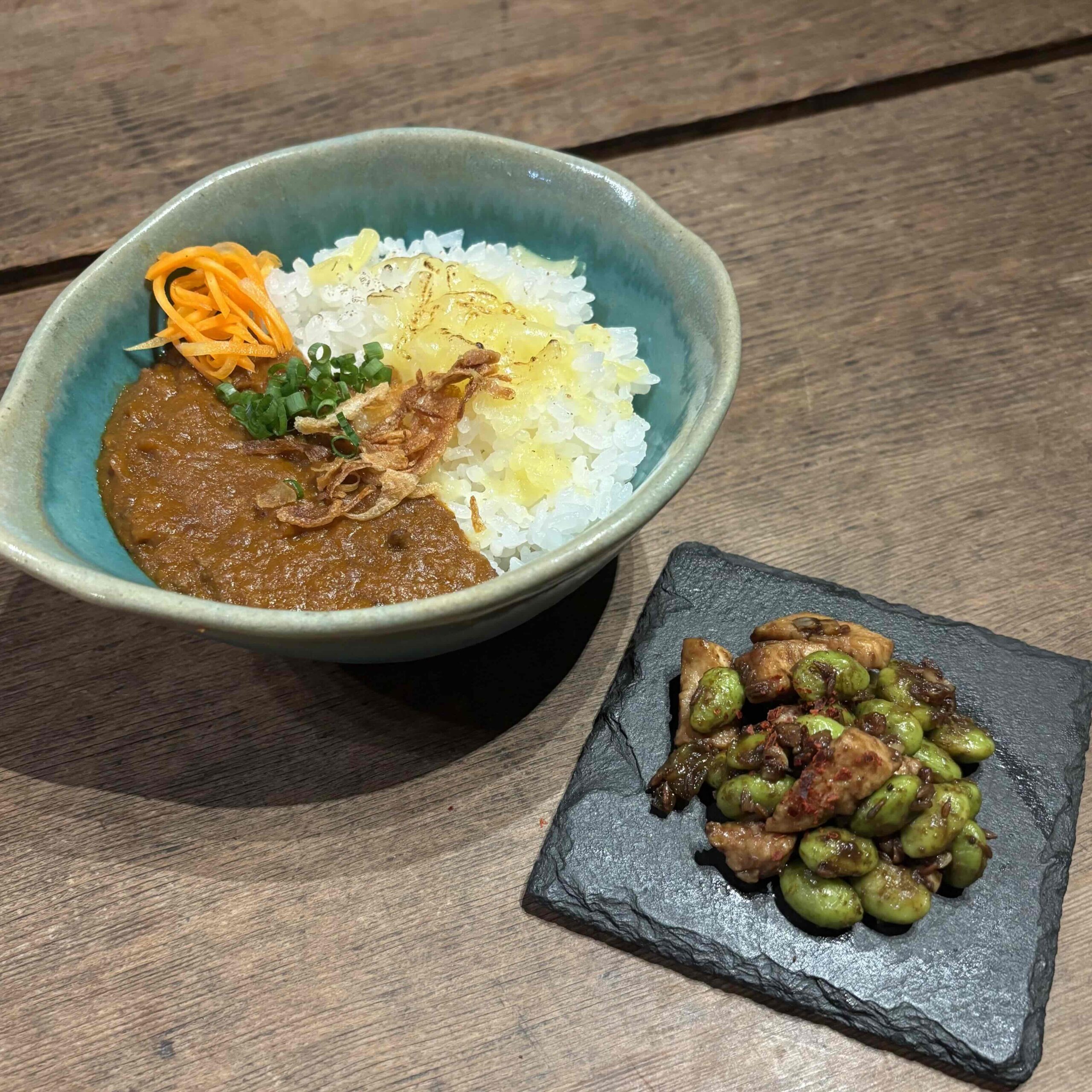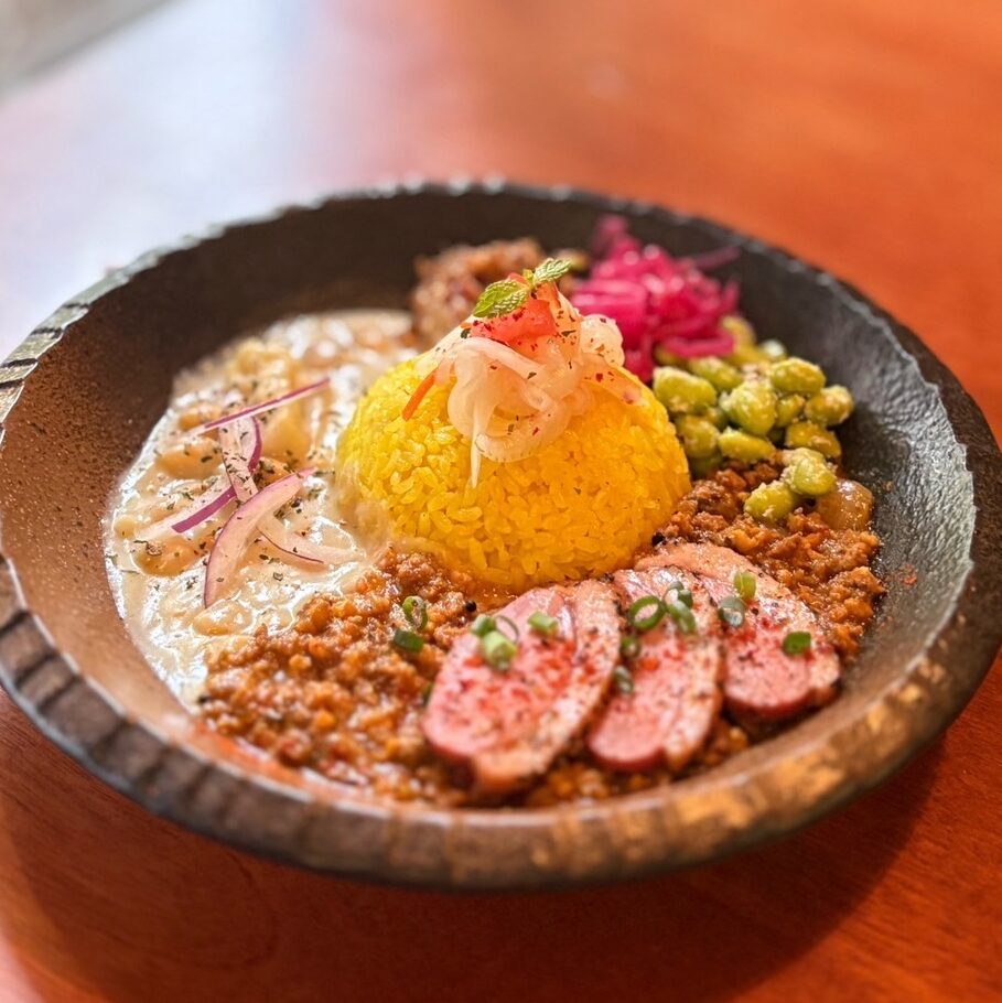 燻製したひき肉をたっぷり使ったU7カレーと、燻製鶏肉をつかったホワイトカレーのあいがけです。ホワイトカレーの生クリーム、チーズのコクでまろやかな濃厚さが、燻製鶏肉・燻製トッピングのスモーキーさと良く合います。