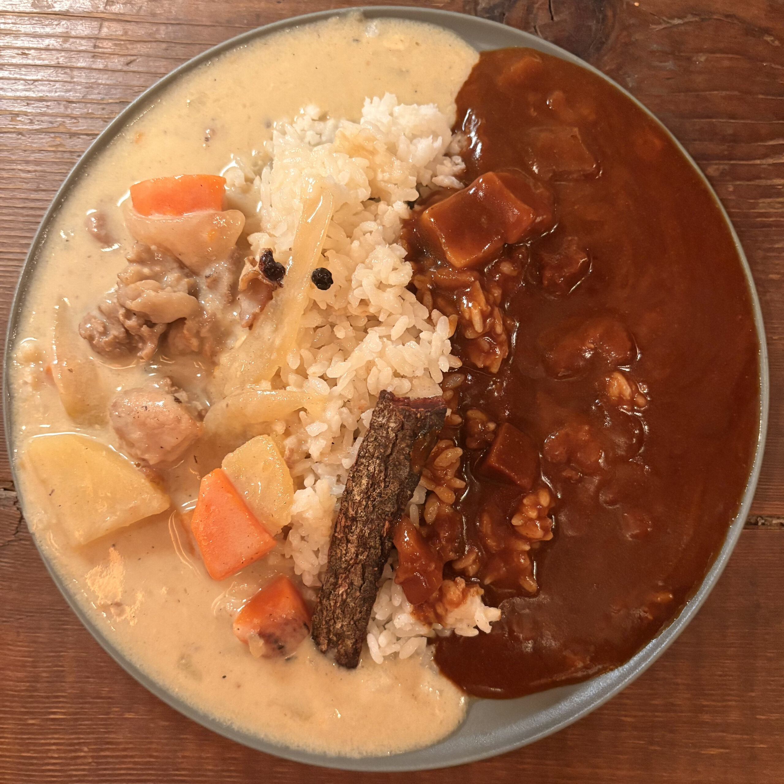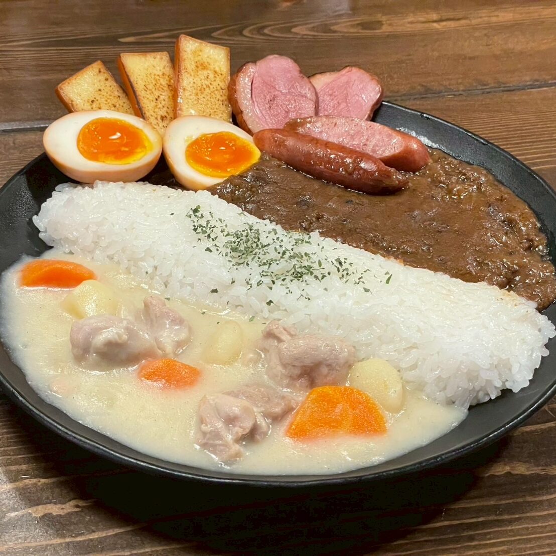 燻製U7カレーとウチの白カレーあいがけ (お得な燻製トッピング付き)(1,400円)