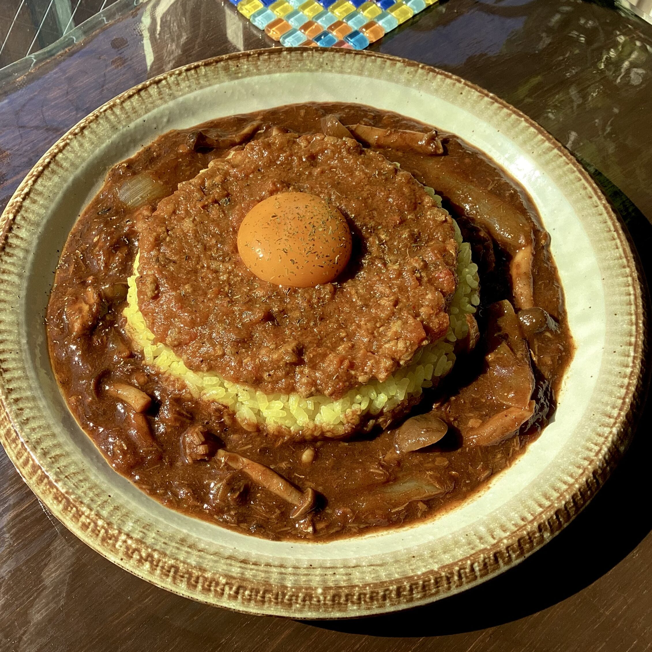 カレーフェス限定の「鯖とキノコのブラックカレー」と 当店人気の「特製キーマカレー」のあいがけカレーです。特製キーマカレーは炙りチーズトッピングも可能です!この機会にぜひお召し上がりくださいませ!