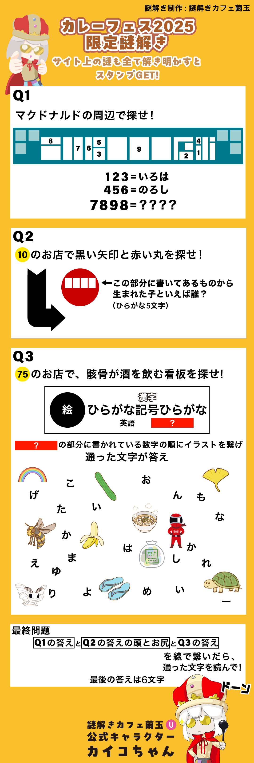 謎解きEVENT 謎の答えを入力してください マップの謎を解き、答えを入力すると続きが見れます。 回答! おめでとうございます! 3つの謎を解いて、最後の答えを導き出そう!答えを受付で伝えると、スタンプを1個GET! ※解答や解説の内容を、SNS等で公開することはご遠慮ください。